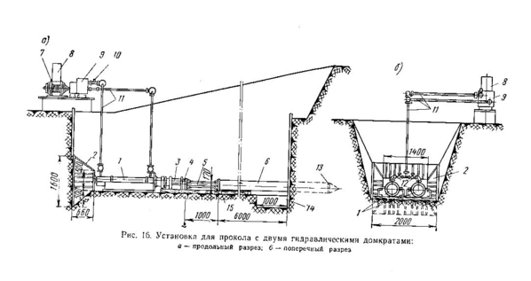 Бестраншейная прокладка трубопроводов способом прокола грунта. Проколом называется такой способ проходки, при котором разработка грунта не производится, а отверстие для трубы образуется за счет уплотнения грунта в радиальном направлении. Прокалывание грунта трубами производят при помощи домкратов, лебедок, тракторов, рычагов и других механизмов, способных развивать усилия 25-300 Т. Усилие может сообщаться прокладываемой трубе при помощи шомпола или с помощью нажимных патрубков. Общая схема установки с двумя гидравлическими домкратами состоит из двух гидравлических домкратов марки ГД-170/1150 [5-стр.480,табл.57.3.]. которые задней своей частью опираются на упор 2. При помощи большой 3 и малой 4 опорных подкладок усилие домкратов передастся через нажимной патрубок 5 на прокладываемую трубу 6. Электродвигатель 7, имеющий щиток управления 8, приводит в движение гидравлический насос 9 с манометром 10. Масло или вода из гидронасоса поступает к домкратам по маслопроводам 11, которые выполняются из труб диаметром 18-25 мм, с толщиной стенки 4,5-5,5 мм. Вентили 12 позволяют в случае надобности отключать каждый из домкратов. Прокладываемая труба на переднем своем торце может иметь наконечник 13 или заглушку. Для сварки прокладываемых труб в передней части котлована устраивается приямок 14.