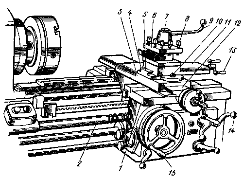 уппорт предназначен для перемещения во время обработки режущего инструмента, закрепленного в резцедержателе. Он состоит из нижних салазок (продольного суппорта) 1, которые перемещаются по направляющим станины с помощью рукоятки 15 и обеспечивают перемещение резца вдоль заготовки. На нижних салазках по направляющим 12 перемещаются поперечные салазки (поперечный суппорт) 3, которые обеспечивают перемещение резца перпендикулярно оси вращения заготовки (детали). На поперечных салазках 3 расположена поворотная плита 4, которая закрепляется гайкой 10. По направляющим 5 поворотной плиты 4 перемещаются (с помощью рукоятки 13) верхние салазки 11, которые вместе с плитой 4 могут поворачиваться в горизонтальной плоскости относительно поперечных салазок и обеспечивать перемещение резца под углом к оси вращения заготовки (детали). Резцедержатель (резцовая головка) 6 с болтами 8 крепится к верхним салазкам с помощью рукоятки 9, которая перемещается по винту 7. Привод перемещения суппорта производится от ходового винта 2, от ходового вала, расположенного под ходовым винтом, или вручную. Включение автоматических подач производится рукояткой 14.