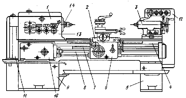 Сборочные единицы (узлы) и механизмы токарно-винторезного станка: 1 - передняя бабка, 2 - суппорт, 3 - задняя бабка, 4 - станина, 5 и 9 - тумбы, 6 - фартук, 7 - ходовой винт, 8 - ходовой валик, 10 - коробка подач, 11 - гитары сменных шестерен, 12 – электро -пусковая аппаратура, 13 - коробка скоростей, 14 – шпиндель.