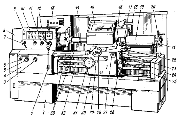 Рукоятки управления: 2 - сблокированная управление, 3,5,6 - установки подачи или шага нарезаемой резьбы, 7, 12 - управления частотой вращения шпинделя, 10 - установки нормального и увеличенного шага резьбы и для нарезания многозаходных резьб, 11 – изменения направления нареза-ния резьбы (лево- или правозаходной), 17 - перемещения верхних салазок, 18 - фиксации пиноли, 20 - фиксации задней бабки, 21 - штурвал перемещения пиноли, 23 - включения ускоренных перемещений суппорта, 24 - включения и выключения гайки ходового винта, 25 - управления изменением направления вращения шпинделя и его остановкой, 26 - включения и выключения подачи, 28 - поперечного перемещения салазок, 29 - включения продольной автоматической подачи, 27 - кнопка включения и выключения главного электродвигателя, 31 - продольного перемещения салазок; Узлы станка: 1 - станина, 4 - коробка подач, 8 - кожух ременной передачи главного привода, 9 - передняя бабка с главным приводом, 13 - электрошкаф, 14 - экран, 15 - защитный щиток, 16 - верхние салазки, 19 - задняя бабка, 22 - суппорт продольного перемещения, 30 - фартук, 32 - ходовой винт, 33 - направляющие станины.