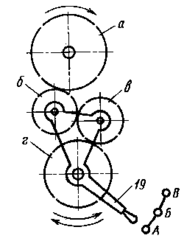 ривод этого механизма осуществляется от коробки скоростей через трензель (смотри рисунок справа), который состоит из четырех зубчатых колес а, б, в, г, связанных с рукояткой 19, переключением которой осуществляется реверс (т. е. изменение направления вращения) вала 20 (приводного вала суппорта). Позиции а, б, в, г, 19 и 20 (см. рисунки). При крайнем нижнем положении рукоятки 19 (положение А) зубчатые колеса а, б, в, г соединены последовательно и направление вращения вала 20 совпадает с направлением вращения шпинделя. При верхнем положении рукоятки 19 (положение В) соединены только зубчатые колеса а, в, г и направление вращения вала 20 изменяется на противоположное. В среднем положении рукоятки 19 (положение Б) зубчатые колеса б и в не соединяются с зубчатым колесом а и вал 20 не вращается.