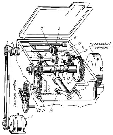 Главный привод станка. В передней бабке размещены коробка скоростей и шпиндель, которые приводят во вращение обрабатываемую деталь при выбранных глубине резания и подаче. На рисунке показано устройство коробки скоростей, которая работает следующим образом. Заготовка зажимается в кулачковом патроне, который крепится к фланцу шпинделя 13. Вращение от электродвигателя 1 через ременную передачу 2 и муфту включения 3 передается на вал 5.