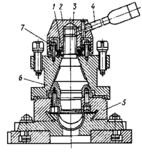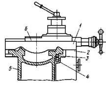стройство резцедержателя показано на рисунке слева. В центрирующей расточке верхних салазок 5 установлена коническая оправка 3 с резьбовым концом. На конусе оправки установлена четырехсторонняя резцовая головка 6. При вращении рукоятки 4 головка 2 перемещается вниз по резьбе конической оправки 3 и через шайбу 1 и упорный подшипник обеспечивает жесткую посадку резцовой головки 6 на конической поверхности оправки 3. От поворота при закреплении резцовая головка удерживается шариком, который заклинивается между поверхностями, образованными пазом на основании конической оправки 3 и отверстием в резцовой головке 6. При необходимости сменить позицию инструмента рукоятку 4 поворачивают против часовой стрелки. При этом головка 2 поворачивается и перемещается вверх по резьбе конической оправки 3, снимая усилие затяжки резцовой головки 6 на конусе конической оправки 3. Одновременно головка 2 поворачивает резцовую головку 6 посредством тормозных колодок, фрикционно связанных с поверхностью расточки головки 2 и соединенных с резцовой головкой 6 штифтами 7. При этом шарик, расположенный у основания конической оправки 3, не препятствует повороту резцовой головки, так как он утапливается в отверстие, сжимая пружину. Если в процессе работы рукоятка 4 (в зажатом положении) стала останавливаться в неудобном положении, то, изменяя толщину шайбы 1, можно установить ее в удобное для рабочего положение.