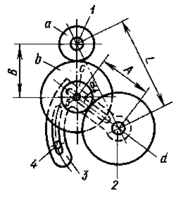 С помощью гитары (сотри рисунок слева) устанавливают (настраивают) зубчатые колеса с определенным передаточным отношением, обеспечивающим необходимое перемещение суппорта на один оборот шпинделя. Расстояние L между валами 1 и 2 является постоянным. На валу 2 свободно установлен приклон 3 гитары, закрепленный болтом 4. Ось 5 промежуточных колес вис можно перемещать по радиальному пазу, тем самым изменяя расстояние А между центрами колес c и d. Дуговой паз приклона 3 позволяет регулировать размер В.
