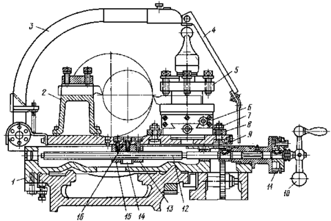 Устройство поперечного суппорта показано на рисунке внизу. По направляющим продольного суппорта 1 ходовым винтом 12, оснащенным рукояткой 10, перемещаются салазки поперечного суппорта. Ходовой винт 12 закреплен одним концом в продольном суппорте 1, а другим - связан с гайкой (состоящей из двух частей 15 и 13 и клина 14), которая крепится к поперечным салазкам 9. Затягивая винт 16, раздвигают (клином 14) гайки 15 и 13, благодаря чему. выбирается зазор между ходовым винтом 12 и гайкой 15. Величину перемещения поперечного суппорта определяют по лимбу 11. К поперечному суппорту крепится (гайками 7) поворотная плита 8, вместе с которой поворачиваются верхние салазки 6 и резцедержатель 5. На некоторых станках на поперечных салазках 9 устанавливается задний резцедержатель 2 для проточки канавок, отрезки и других работ, которые могут быть выполнены перемещением поперечного суппорта, а также кронштейн 3 с щитком 4, защищающим рабочего от попадания стружки и смазочно-охлаждающей жидкости.