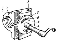 родольная подача суппорта 1 от ходового винта 2 производится включением разъемной гайки рукояткой 14 (смотри рисунок слева). Разъемная гайка состоит из двух частей (1 и 2), которые перемещаются по направляющим А при повороте рукоятки 5. При этом диск 4 посредством прорезей В, расположенных эксцентрично, перемещает пальцы 3, в результате чего обе части гайки сдвигаются или раздвигаются. Если обе части гайки охватывают ходовой винт, то производится продольная подача (перемещение) суппорта; если они раздвинуты, то подача отключается.