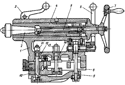 стройство задней бабки показано на рисунке. В корпусе 1 (при вращении винта 5 маховиком 7) перемещается пиноль 4, закрепляемая рукояткой 3. В пиноли устанавливается центр 2 с коническим хвостовиком (или инструмент). Задняя бабка перемещается по направляющим станка вручную или с помощью продольного суппорта. В рабочем неподвижном положении задняя бабка фиксируется рукояткой 6, которая соединена с тягой 8 и рычагом 9. Сила прижима рычага 9 тягой 8 к станине регулируется гайкой 11 и винтом 12. Более жесткое крепление задней бабки производится с помощью гайки 13 и винта 14, который прижимает к станине рычаг 10.