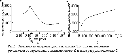 Твердость покрытия зависит от парциального давления реактивного газа, температуры подложки и потенциала на подложке. Так например, твердость TiC достигает 3000 кгс/мм2 при парциальном давлении реактивного газа (1.11.3)10-3 мм рт. ст., температуре подложки 650 оС и потенциале на подложке 050 В.