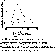 На рис.8 показано влияние давления аргона, в процессе ионного осаждения, на однородность однослойного покрытия (соотношение между толщиной покрытия на передней и задней поверхностях подложки) [3].