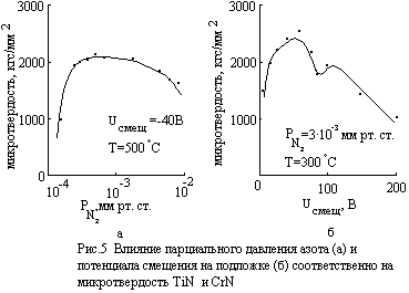 На рис.5 показано влияние парциального давления азота и потенциала на подложке на микротвердость покрытий из TiN и CrN, полученных осаждением в разряде с полым катодом [3].