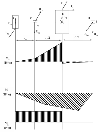 Изгибающий момент M=Fвl3= 614 H*мм.