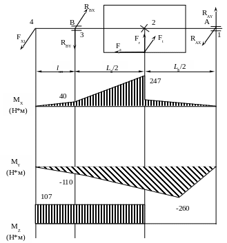 Изгибающий момент M=Fвl3= 110213 H*мм.