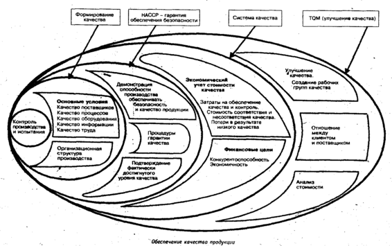 Промышленность часто колеблется между внедрением системы, основанной на применении метода НАССР, которая является только одним из возможных способов обеспечения безопасности и качества, и системой качества по нормам ИСО серии 9000, которые используются для признания на международном уровне. Поэтому необходимо отметить, что нормы ИСО peгламентируют только элементы организации системы, необходимость осуществления формальных и специальных процедур. Они не содержат описания используемых технических средств, указаний по установке относительных гарантий качества. Метод НАССР позволяет ввести в производство конкретное воздействие на продукт, на процесс, на определенный конкретный риск. Преимущества этого метода заключаются в том, что он рассматривает не только элементы идентификации и анализа риска, но и элементы управления критическими точками и элементы оценки результатов управления. Многие принципы НАССР совпадают с основными положениями норм ИСО серии 9000. Это создает на предприятии отличную возможность для создания и поддержания в порядке эффективной и действенной системы качества. Наиболее эффективно для пищевых предприятий не противопоставление этих систем, а их совмещение. При созданной системе НАССР легче перейти к системе качества по моделям ИСО. Место системы НАССР в общей системе качества показано на рисунке. Выделенные блоки включают в себя все необходимые элементы для формирования качества и создания системы определенного уровня.
