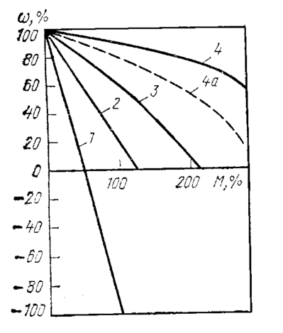 На рис. 1 приведены механические характеристики указанной схемы. Для этих характеристик за 100 % момента принят номинальный момент электродвигателей серий МТР и МТН в режиме ПВ=40 %, за 100 % скорости—синхронная частота вращения электродвигателя. Эти характеристики рассчитаны, исходя из условий обеспечения необходимых параметров ускорения электропривода при пуске и торможении в режиме противовключения. Для обеспечения нормального пуска в схеме предусмотрены невыключаемые ступени резисторов в цепи ротора. При переводе рукоятки командоконтроллера из нулевого положения в первое осуществляется задержка на время срабатывания реле противовключения КV2. Дальнейший разгон происходит под контролем реле КТТ и К.Т2, причем реле К.Т1 обеспечивает переход на характеристики, соответствующие третьему и четвертому положениями командоконтроллера. Диапазон выдержек времени этих реле (при отпадании якоря), определяющих интенсивность ускорения, 0,4—2,5 с.