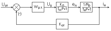 Отнесем время запаздывания тиристорного преобразователя п и инерционность фильтров Тф к некомпенсированным постоянным времени, т.е. Т=п+ Тф=0,01 с. Тогда, если не учитывать внутреннюю обратную связь по ЭДС двигателя, можно записать передаточную функцию объекта регулирования тока: