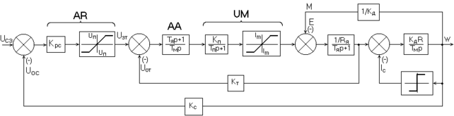 Пропорциональный регулятор скорости AR и пропорциональный регулятор тока AA формируют управляющие воздействия из сигналов задания Uсз и Uзт и обратных связей Uос и Uот.