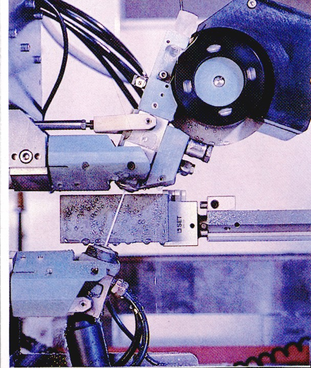 Для автоматической заправки проволоки используется отъюстированная водяная струя давлением 5 бар диаметром 2мм (AGIEJET). При включении струи, конец проволоки пропускается через ее середину. Не имея возможности выйти из обтекающей струи даже при наклонной заправке до 30, проволока достигает нижней всасывающей дюзы, проводится через направляющую, головку и подхватывается двумя лентами, движущимися циклично навстречу друг другу (рис. 4). Натяжение проволоки создается верхним тормозом “Conofil”. Он прикреплен к верхней головке и работает на принципе электромагнитного поля, возникающего вокруг обмоток статора и придерживающего металлический ротор с валом, на конце которого установлены два твердосплавных кольца с фасками. Проволока петлей укладывается в призматическую канавку, образующуюся при стыковке колец, затем вводится в верхнюю головку.