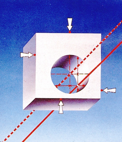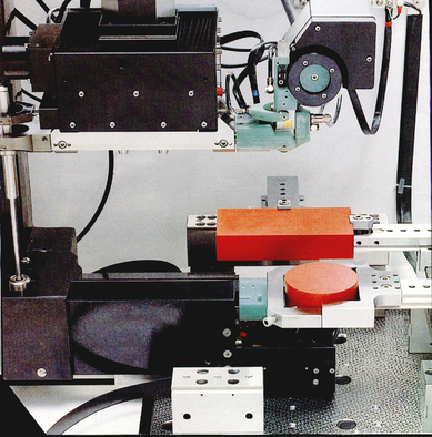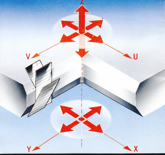 Направляющая для проволоки выполнена по принципу призмы, которую составляет пара искусственных конусных алмазов, пристыкованных друг к другу усеченными вершинами конусов. Срок службы направляющей – 8,000 часов. Верхняя и нижняя направляющие вставлены в соответствующие головки, которые имеют дюзы для промывки под давлением и токоподводы. Головки через изолирующие вилки шарнирно закреплены на верхнем и нижнем плече С-образной системы AGIECONIC. Верхнее плечо жестко связано с координатной головкой (оси U и V), а та, в свою очередь, скреплена с осью Z. Так же верхнее плечо шарнирно соединено с нижним через телескопически удлиняющийся рычаг. Это позволяет без потерь передавать вращательное движение осей U и V не только верхнему плечу, но и нижней головке (рис. 3).