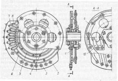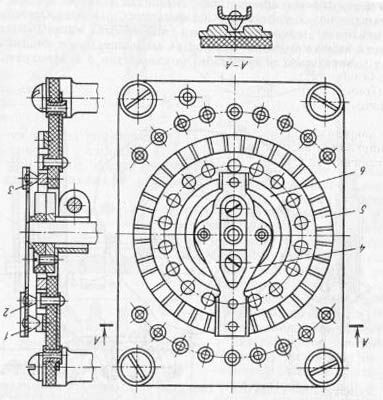 Для механизмов дистанционной настройки, имеющих большое количество фиксированных положений (более 20), применяют переключатели с уменьшенным числом контактов. Такой переключатель на 66 положений показан на рисунке. Он представляет собой фактически два переключателя. Первый переключатель состоит из контактного кольца 1 и шести секторов 5, расположенных на неподвижной плате 2. На подвижной плате 4 размещен сдвоенный пружинный контакт 10, с помощью которого находится заданный сектор. Второй переключатель состоит из сектора 6 и одиннадцати контактов 7 и 8, расположенных в пределах одного сектора 5. На подвижной плате 4 находится шесть пружинных контактов 9, с их помощью находится соответствующий контакт внутри сектора.