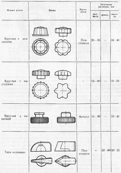 В радиоаппаратуре применяют поворотные ручки различных видов и конфигураций. Наиболее удобными являются ручки круглой формы, на цилиндрической или конической поверхности которых делаются скругленные выступы или впадины различных профилей. В радиоаппаратуре наиболее распространены пластмассовые ручки. Широко используются ручки типа «клювик», заостренный носик является указателем положения, в котором находится исполнительное устройство.
