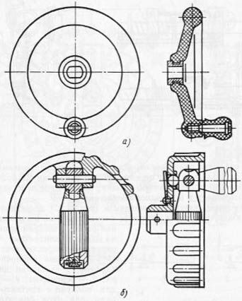Элементы управления, по внешнему виду аналогичные круглым ручкам с выступами или впадинами, но имеющие диаметр более 50 мм называют маховичками. Они бывают двух видов: без рукоятки и с рукоятками. Маховички без рукояток применяют в тех случаях, когда пределы их поворота составляют не более пяти оборотов, они рассчитаны на захват пальцами рук или ладонью. Обычно их диаметры делают 50-100 мм. Маховички с рукоятками служат для непрерывного вращения, их применяют для удобства настройки радиоаппаратуры, когда валик нужно повернуть на любое количество оборотов, не перехватывая руки, маховички для непрерывного вращения бывают сплошными и со спицами, с постоянной ручкой и откидывающейся.