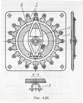 На плите 1 печатным способом нанесены 20 контактов I и кольцо П, по которому скользят проволочные контакты 2 , закрепленные на ползунке 3.