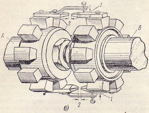 | Такая установка скоб для центровки двух валов А и В, соединенных кулачковой муфтой, приведена на рис. 17.1 - в. Для удобства центровки роторов с кулачковыми муфтами со звездочек обеих центрируемых роторов обычно снимаются полумуфты (коронки), хотя эти и некоторые другие подвижные муфты позволяют производить центровку, не разъединяя их. На кулачки звездочек привертываются жесткие стальные скобы, дающие возможность измерять радиальный и аксиальный зазоры между двумя полумуфтами. К диаметрально противоположным кулачкам звездочек обоих валов привертываются другие скобы, также дающие возможность проверять радиальный и осевой зазоры. Замеры проводятся при одновременном поворачивании обоих роторов на 90, 180, 270 и 360°, т. е. каждый раз поворачивая роторы на 90° по отношению к предыдущему положению, пока не будет пройден полный оборот. При каждом из этих положений с помощью щупа замеряются аксиальные и радиальные зазоры; замеры при повороте на 360° должны совпадать с величинами, полученными при нулевом положении роторов; эти замеры являются контрольными. Пластины щупа следует подбирать так, чтобы плотно сжатыми пластинами чувствовалось касание как муфты, так и измерительной скобы. При отсутствии возможности, из-за конструктивных особенностей непосредственно замерять нижние радиальный и аксиальный зазоры; эти зазоры определяются расчетным путем, как разность между суммой боковых зазоров и соответствующим верхним зазором. При правильном положении роторов все радиальные и аксиальные замеры зазоров по скобам полумуфт, производимые в холодном состоянии турбины щупом или индикатором с точностью до 0,01 мм, при одновременном повертывании роторов в любое положение на одинаковый угол, должны быть одинаковыми или во всяком случае расцентровка роторов турбин на 3000 об/мин не должна превышать: для жестких муфт 0,03— 0,04 мм, для полужестких и пружинных муфт 0,05—0,06 мм и для кулачковых муфт 0,08 мм. Замеры, производимые при центровке, принято записывать в формуляр. При анализе результатов измерений, произведенных в холодном состоянии турбины, необходимо учитывать те изменения в положении роторов, которые произойдут в процессе работы турбоагрегата; положение линии роторов горячей турбины значительно отличается от положения ее в холодном состоянии. | ||||||