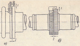 | Проверка центровки по муфтам производится с помощью специальных скоб с указательными винтами, которые позволяют производить замеры аксиальных и радиальных отклонений осей роторов. Скобы укрепляются на болтах, ввертываемых в специально предусмотренные отверстия в полумуфтах; если этих отверстий нет, их следует просверлить и нарезать. По окончании центровки и снятии скоб в отверстия следует завернуть пробки с прорезью под отвертку для сохранения баланса полумуфт; если же отверстия просверлены на двух взаимно противоположных сторонах полумуфт, то пробок можно не ставить. Скобы следует изготовлять достаточно жесткими и закреплять на полумуфтах прочно, без слабины; это необходимо во избежание отжатия скобы во время замеров, когда между ней и полумуфтой просовываются пластинки щупа; концы указательных винтов должны быть закруглены. Отжатие скобы и отсутствие закругления винтов приводят к существенным ошибкам в центровке; в достаточной жесткости скоб и закреплении их без слабины нетрудно убедиться, если после плавного отжатия от руки свободного конца скобы от муфты и такого же прижатия измеряемый зазор возвращается к первоначальному. Конструкции скоб для измерения щупом при центровке роторов. а с полужесткими муфтами; б с пружинными муфтами; в с кулачковыми муфтами; 1 радиальные и 2 осевые замеры. Рис. 17.1 | |||||||
