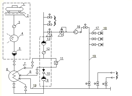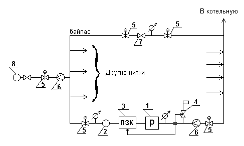 Рис. 6.3Газорегуляторный пункт (ГРП) – это одноэтажное здание, выполненное из огнеупорного материала, закрытое на ключ. Газ в ГРП поступает из магистрального газопровода. Давление в газопроводе 12-13 атм. (высокое давление) или 5-6 атм. (среднее давление). Для надежной работы котла на газе давление перед горелками должно быть 1,2-1,5 атм. Для дросселирования газа и сооружается ГРП. В помещении ГРП поток газа разделяется на нитки (4-5 ниток, из которых одна резервная). На каждой нитке, кроме регулятора, стоит фильтр, ПЗК и ПСК. Фильтр очищает газ от пыли. ПЗК срабатывает и выключает нитку, если давление газа за регулятором поднимается на 25% от рабочего. ПСК срабатывает и сбрасывает газ в атмосферу, если давление газа за регулятором кратковременно поднимается на 10% от рабочего Если в магистральном газопроводе давление падает до 3 атм., то регулятор дросселировать не может. Все нитки отключаются и переходят на ручное регулирование на байпасные нитки. | |||||||