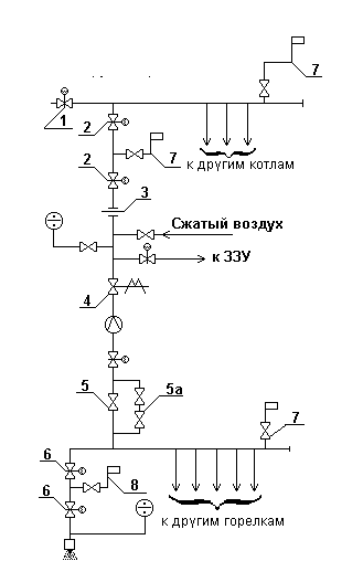 5 и 5а. Регулирующий и растопочный клапан. 6. Две запорные задвижки с электроприводом на вводе в горелки.