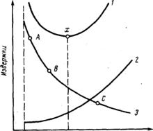 «Чарт» зависимости между издержками перевозок и сроками доставки груза при различных видах транспорта: А – транспорт А; В – транспорт В; С – транспорт С; 1 – суммарные издержки от перевозок и упрощенной выгоды; 2 – потери от упущенной выгоды; 3 – издержки от перевозки.