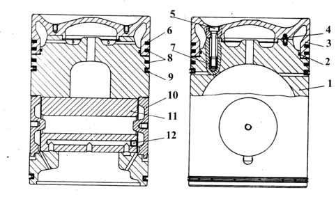 1-тронк; 2-уплотнительное кольцо; 3-головка; 4-штифт; 5-болт; 6-первое компрессионное кольцо; 7-резьбовая вставка; 8-второе и третье компрессионные кольца; 9-маслосъёмное кольцо; 10-крышка; 11-поршневой палец; 12-шпилька.