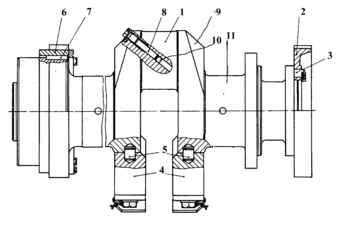 вала; 7-шпонка; 8-заглушка; 9-щека; 10-отверстие; 11-рамовая шейка.