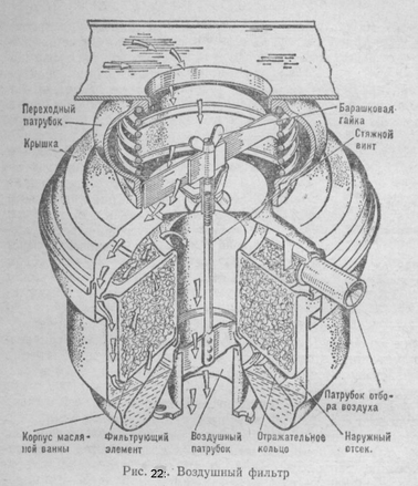Воздух под действием разрежения, создаваемого работающим двигателем, через патрубок попадает во входную кольцевую щель и, двигаясь по ней вниз, ударяется о масло, к которому прилипают крупные частицы пыли. При дальнейшем движении воздух подхватывает частицы масла и смачивает им фильтрующий элемент. Масло, стекающее с фильтрующего элемента, смывает частицы пыли, осевшие на отражателе. Воздух, проходя через фильтрующий элемент, полностью очищается от механических примесей и по центральному патрубку поступает в смесительную камеру карбюратора.