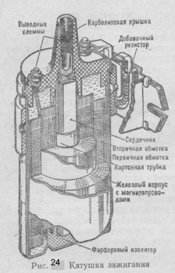 атушка зажигания служит для преобразования тока низкого напряжения в ток высокого напряжения (с 12 В 3—24 кВ). Она состоит из следующих основных частей (рис. 24): сердечника, первичной обмотки из 250...400 ков толстого изолированного медного провода диаметром 0,8 мм, картонной трубки, вторичной обмотки ... 25 тыс. витков тонкого провода диаметром 0,1 мм, железного корпуса с магнитопроводами, карболитовой крышки, клемм и добавочного резистора. Вторичная обмотка расположена под первичной и отделена от нее слоем изоляции. Концы первичной обмотки выведены на клеммы карболитовой крышки. Один конец вторичной обмотки соединен е первичной обмоткой, а второй выведен а центральную клемму карболитовой крышки.