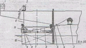 Рис- 5. Устройство швартовки к центровки лихтера. ; — пост управления лебедками; г — откидывающаяся балке;