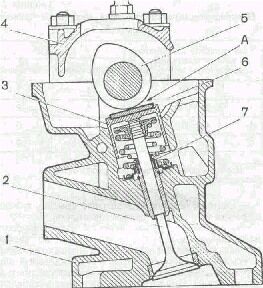 1 - головка цилиндров; 2 - клапан; 3 - толкатель; 4 - корпус подшипников распределительного вала; 5 - распределительный вал; 6 - регулировочная шайба; 7 - маслоотражательный колпачок; А - зазор между кулачком и регулировочной шайбой.