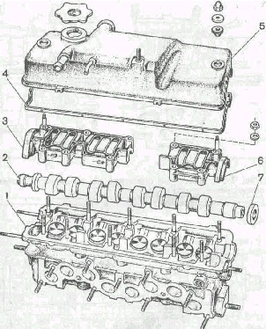 Рис. 3.3. Устройство головки цилиндров: 1 - головка цилиндров; 2 - распределительный вал; 3 - задний корпус подшипников распределительного вала; 4 - прокладка; 5 - крышка головки цилиндров; б - передний корпус подшипников распределительного вала; 7 – сальник.
