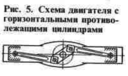 В установках различного назначения применяют также двигатели с горизонтальными противолежащими цилиндрами (рис. 5). Для машин наземного транспорта небольшая высота двигателя данного типа и удобство размещения его в машине являются в некоторых случаях несомненными преимуществами по сравнению с двигателями, имеющими вертикально или V-образно р