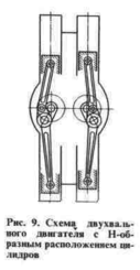 связи с необходимостью создания мощных быстроходных двигателей значительное внимание уделяется двухвальным и многовальным конструкциям. Конструктивные схемы подобных двигателей весьма разнообразны. Двухвальные двигатели могут быть выполнены сдвоенными с двумя рядами параллельно расположенных цилиндров (рис. 8). В этом случае два коленчатых вала соединены между собой зубчатой передачей. Необходимо отметить также двигатели с Н-образно (рис. 9) и I-образно расположенными цилиндрами. Наконец, цилиндры могут быть расположены под углом и иметь общую (для двух цилиндров) камеру сгорания.