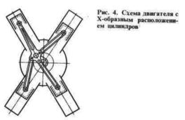 В некоторых случаях двигатели выполняют с Х-образно расположенными цилиндрами (рис. 4). Такие двигатели имеют небольшие размеры по длине. Детали кривошипно-шатунного механизма, корпуса и распределительного механизма в этом случае имеют очень сложную конструкцию. Углы между осями цилиндров могут быть или разными (рис. 4), например 45, 60 и 120°, или одинаковыми.