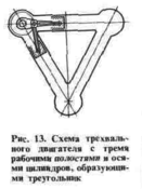 с тремя коленчатыми валами, тремя рабочими полостями и осями цилиндров, образующими треугольник (рис. 13);