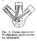 Аналогичные преимущества имеют двигатели с W-образно расположенными цилиндрами (рис. 3), но большого распространения они не получили, главным образом вследствие сложности конструкции шатунов, подшипников и других узлов и деталей. Однако в последнее время конструкторы вновь стали применять эту схему.