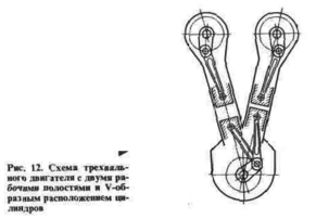 с двумя коленчатыми валами и сдвоенными, ромбообразно расположенными цилиндрами; с тремя коленчатыми валами, двумя рабочими полостями и V-образно расположенными перевернутыми цилиндрами (рис. 12);