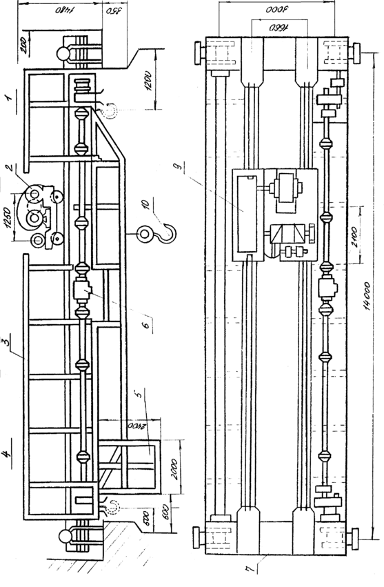 1 – демпфер; 2 – грузовая тележка; 3 – мост крана; 4 – ходовые колеса моста; 5 – кабина; 6 – привод механизма передвижения крана; 7 – концевая балка; 8 – трансмиссионный вал; 9 – барабан; 10 – крюковая подвеска.