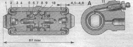 Рис. 6. Колёсный цилиндр: 1 – упор колодки; 2 – защитный колпачок; 3 – корпус цилиндра; 4 – поршень; 5 – уплотнитель; 6 – опорная тарелка; 7 – пружина; 8 – сухари; 9 – упорное кольцо; 10 – упорный винт; 11 – штуцер; А – прорезь на упорном кольце.