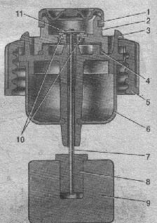 Рис. 7. Датчик аварийного уровня тормозной жидкости: 1 – защитный колпачок; 2 – корпус датчика; 3 – основание датчика; 4 – уплотнительное кольцо; 5 – зажимное кольцо; 6 – отражатель; 7 – толкатель; 8 – втулка; 9 – поплавок; 10 – неподвижные контакты; 11 – подвижный контакт.