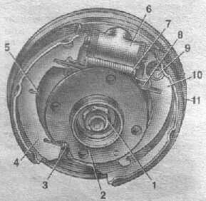 Рис. 5. Тормозной механизм заднего колеса: 1 – гайка крепления ступицы; 2 – ступица колеса; 3 – нижняя стяжная пружина колодок; 4 – тормозная колодка; 5 – направляющая пружина; 6 – колёсный цилиндр; 7 – нижняя стяжная пружина; 8 – разжимная планка; 9 – палец рычага привода стояночного тормоза; 10 – рычаг привода стояночного тормоза; 11 – щит тормозного механизма.