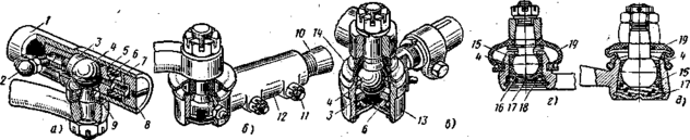 У легковых автомобилей с расчлененной рулевой трапецией при независимой подвеске колес рулевой привод включает рулевую сошку 8 (см. рис. 2, в, г) с маятниковым рычагом 10, среднюю поперечную тягу 9, боковые тяги 11 и рулевые рычаги 12 поворотных кулаков или стоек. Сочленения тяг и рычагов рулевого привода также снабжены шаровыми шарнирами. Применяют шарниры разборного или неразборного типа (рис. 5, г, д), с шаровыми 4 или полусферическими пальцами, установленными в наконечниках тяг обычно на пластмассовых (полиуретановых, полиамидных и др.) вкладышах 15, поджимаемых подпятниками 16 с пружинами 18. Шаровые сочленения хорошо герметизированы — надежно защищены резиновыми чехлами 19; смазку в них обычно закладывают при сборке и в процессе эксплуатации не дополняют. В разборном шарнире крышка 17 (рис. 5, г) головки шарнира съемная, закреплена стопорным кольцом; в неразборном крышка завальцована в головке (рис. 5, д).