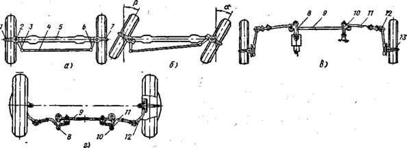 В трапецию входят (рис. 2, а) передняя ось 5, рулевые рычаги 3 и 6, соединенные с поворотными кулаками 1 и 7, и поперечная рулевая тяга 4. Поворотные кулаки шарнирно соединены с осью шкворнями 2.